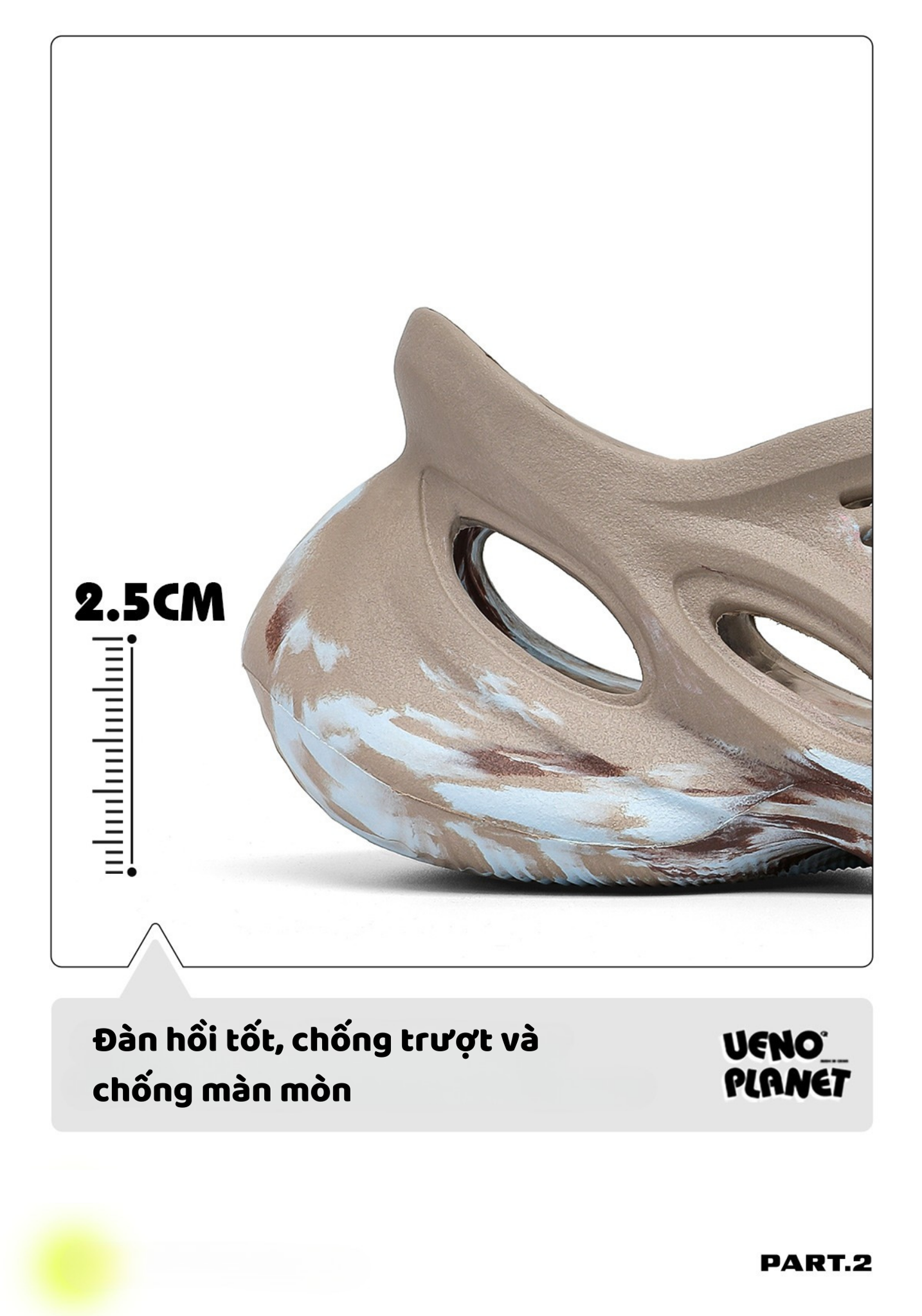 Thông số kỹ thuật - Thương hiệu: Ueno Planet - Chất liệu: EVA cao cấp (siêu nhẹ, đàn hồi, chống thấm nước) - Màu sắc: Đa dạng gồm đen loang đỏ, xám loang trắng, be loang hồng xanh và xám kem loang - Kiểu đế: Đế đúc liền khối chống trơn trượt, đàn hồi tốt, bám chắc trên nhiều bề mặt. - Kích cỡ: Từ size 36 đến 45 - Phong cách: Hiện đại, cá tính, streetstyle