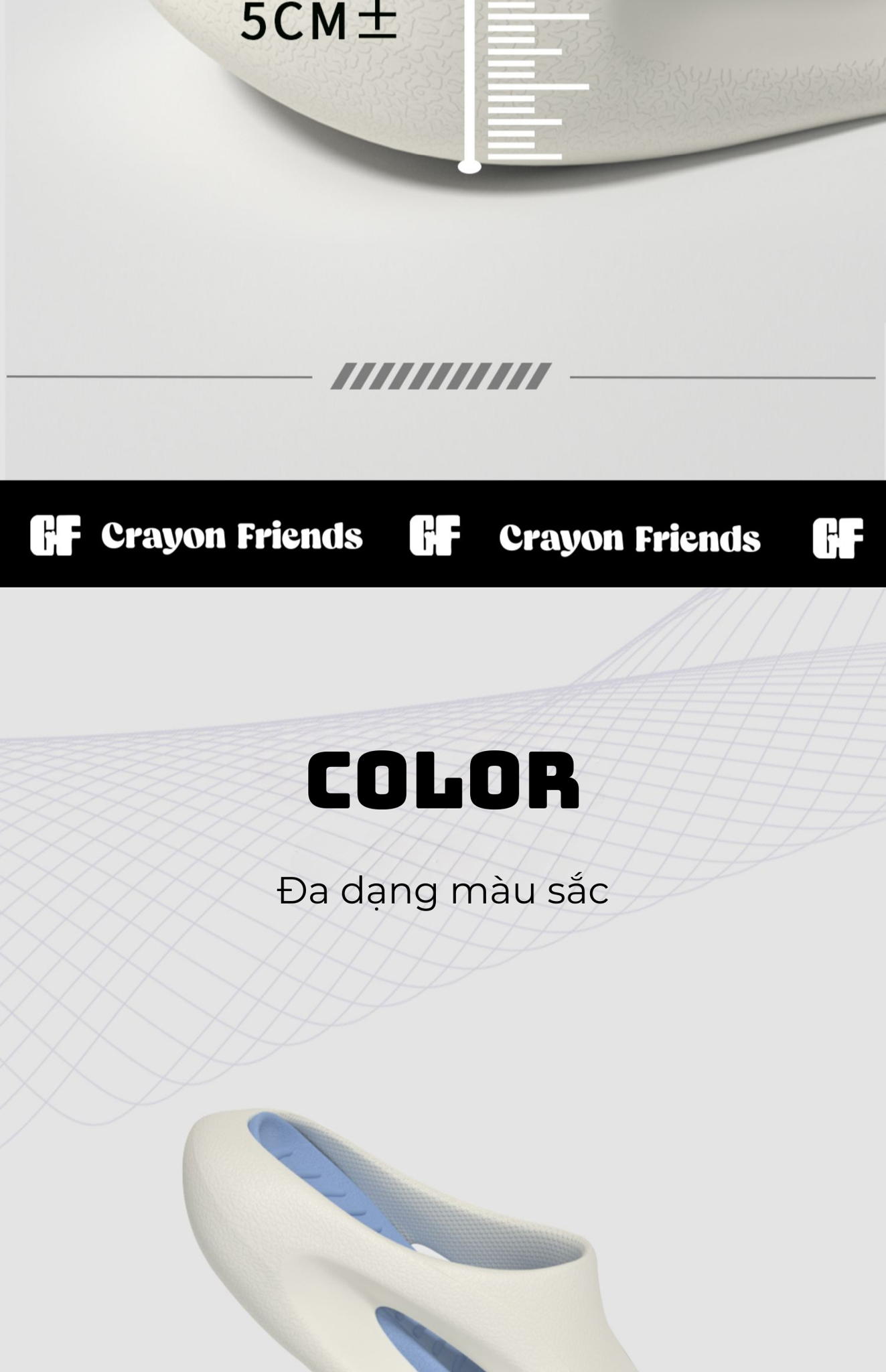 Thông số kỹ thuật - Thương hiệu: Crayon Friends - Chất liệu: Đế EVA cao cấp đúc nguyên khối 5cm siêu êm - Màu sắc: Đa dạng gồm trắng lót xanh, trắng lót đen, be lót nâu , trắng lót cam, đen lót trắng, be nguyên, đen - Kiểu đế: Đế Y sâu và rộng, chống trượt, dày 5cm, tạo lực ma sát 360° - Kích cỡ: Từ size 36/37 đến 44/45 - Phong cách: Hiện đại, trẻ trung, năng động