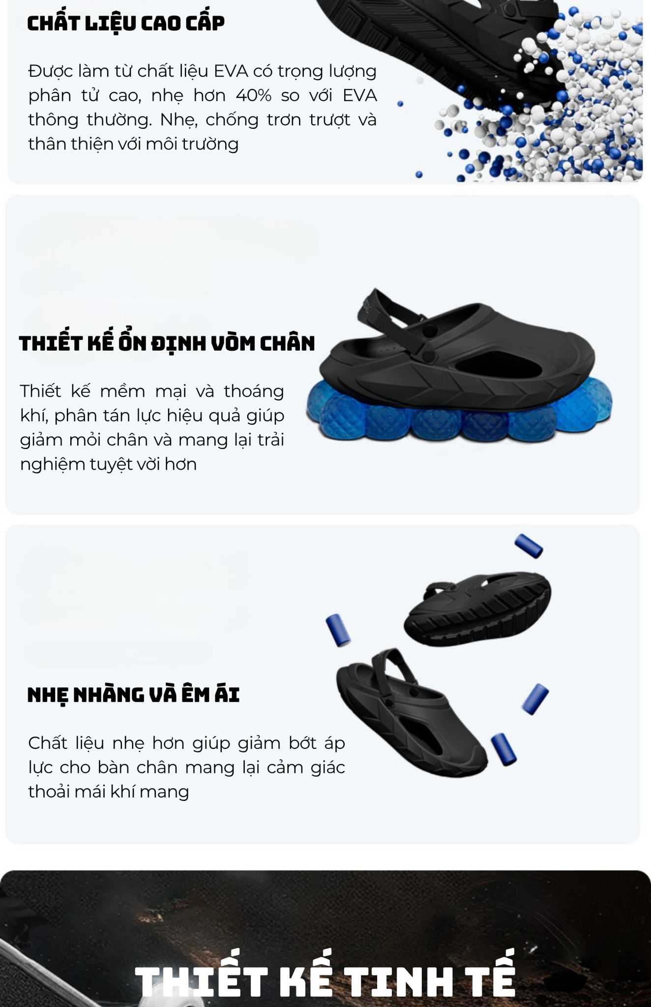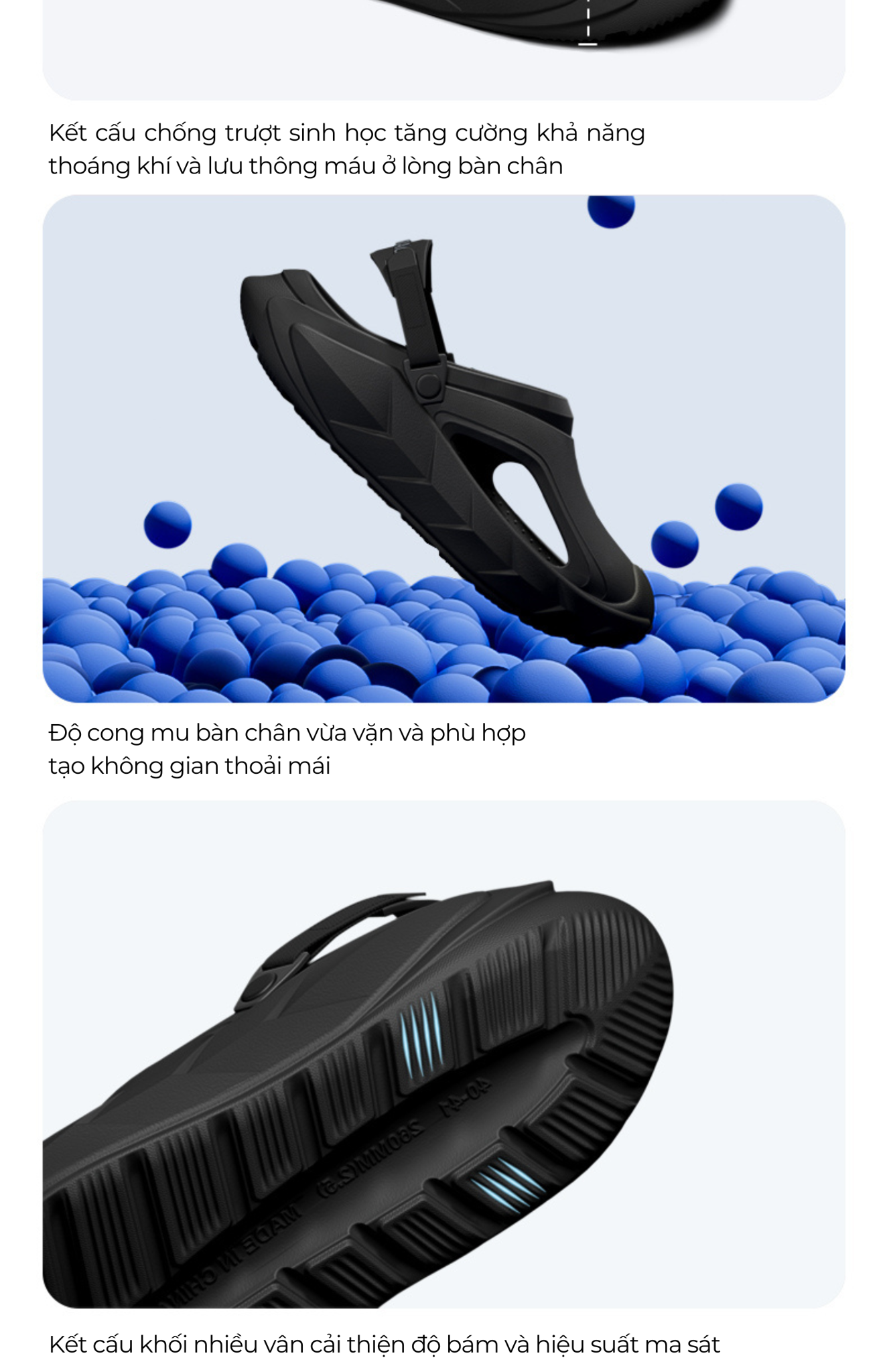 Công nghệ cảm biến mới: Tăng khả năng chống trượt và độ bền của đế giày. Thiết kế đế giày: Kết cấu chống trượt, tăng khả năng bám dính tốt trên nhiều bề mặt. Lực đẩy giảm lực: Giảm tác động lực lên chân, mang lại cảm giác thoải mái khi di chuyển. Dễ dàng vệ sinh: Có thể giặt sạch sau thời gian dài sử dụng, giữ cho dép luôn mới. Chống trơn trượt: Đế giày có họa tiết chống trượt, phù hợp cho mọi điều kiện thời tiết. Thiết kế đế đặc biệt: Phản ứng đàn hồi tốt, giảm đau và mỏi chân, phù hợp cho hoạt động hàng ngày hoặc thể thao.